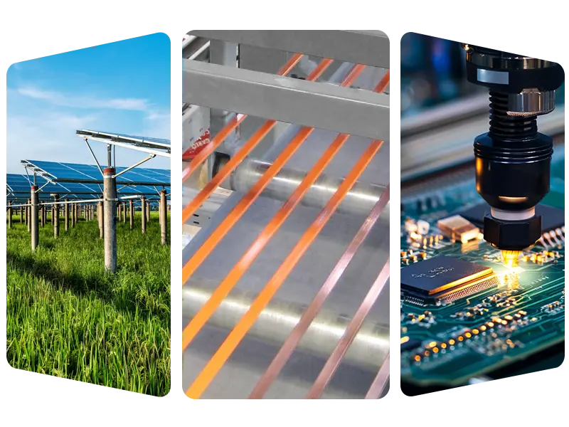 • Fotovoltaik maydon: komponentlarga elektr energiyasini samarali o'tkazishga yordam berish uchun fotovoltaik payvandlash lentalari va shinalarni ommaviy ishlab chiqarish.